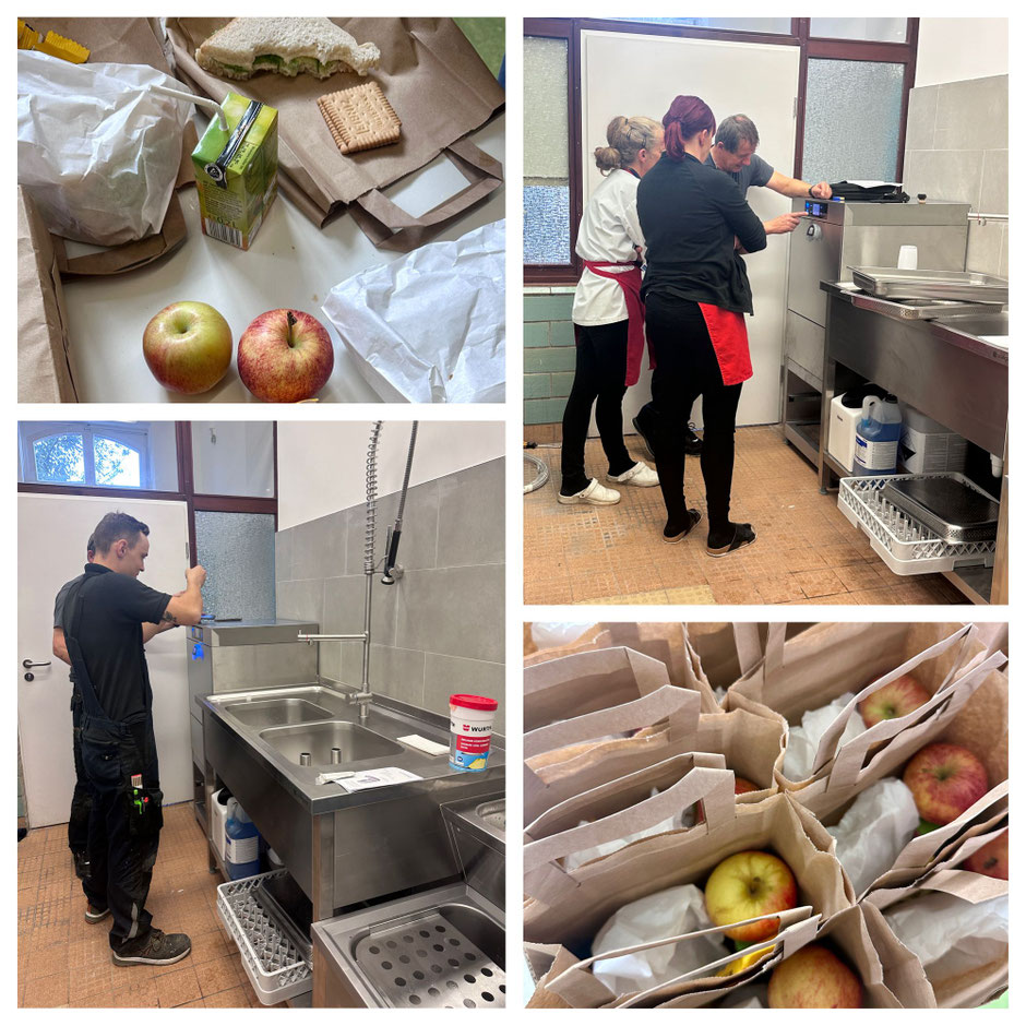 Wer denkt, dass wir es am 1. Tag nach den Ferien erstmal ruhig angehen lassen, der irrt sich. Für unsere 1. und 2. Klassen ist heute das diesjährige Respect-Projekt gestartet, die Zahnärztin ist im Haus und natürlich wurden fleißig Ferienerlebnisse ausgetauscht. DAS Highlight war aber die Inbetriebnahme der Spülmaschine in unserer Mittagsküche. Nach 10 Jahren war es heute endlich soweit! 🥳Die Mitarbeiter der Firma Neltner (Großkücheneinrichtung) bauten nicht nur alles auf, sondern erklärten unseren Küchenfeen auch die Handhabung bis ins Detail. Ein Spülgang dauert nur 90 Sekunden. Ein echtes Wunderding! Da hat das Warten sich gelohnt! 😊 Für die Kinder gab es heute letztmalig Kaltverpflegung und für morgen stehen zur Feier des Tages Pommes auf dem Plan. 🍟