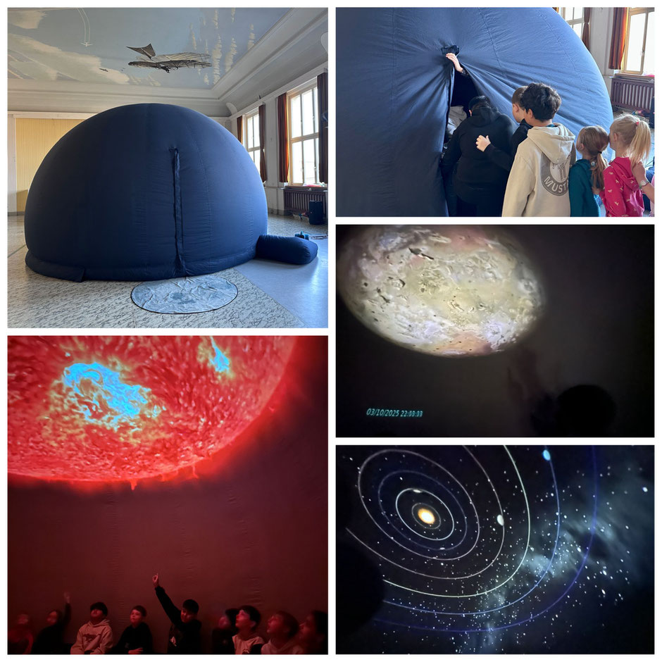 Unsere Aula verwandelte sich diese Woche in ein Planetarium und die Kinder der 3. und 4. Klassen konnten faszinierende Einblicke in die Welt der Sterne, Monde und Planeten gewinnen. Begleitet von Dr. Ruth Grützbauch (Astronomin und Planetariumsdirektorin) ging es auf ins Weltall! 🪐