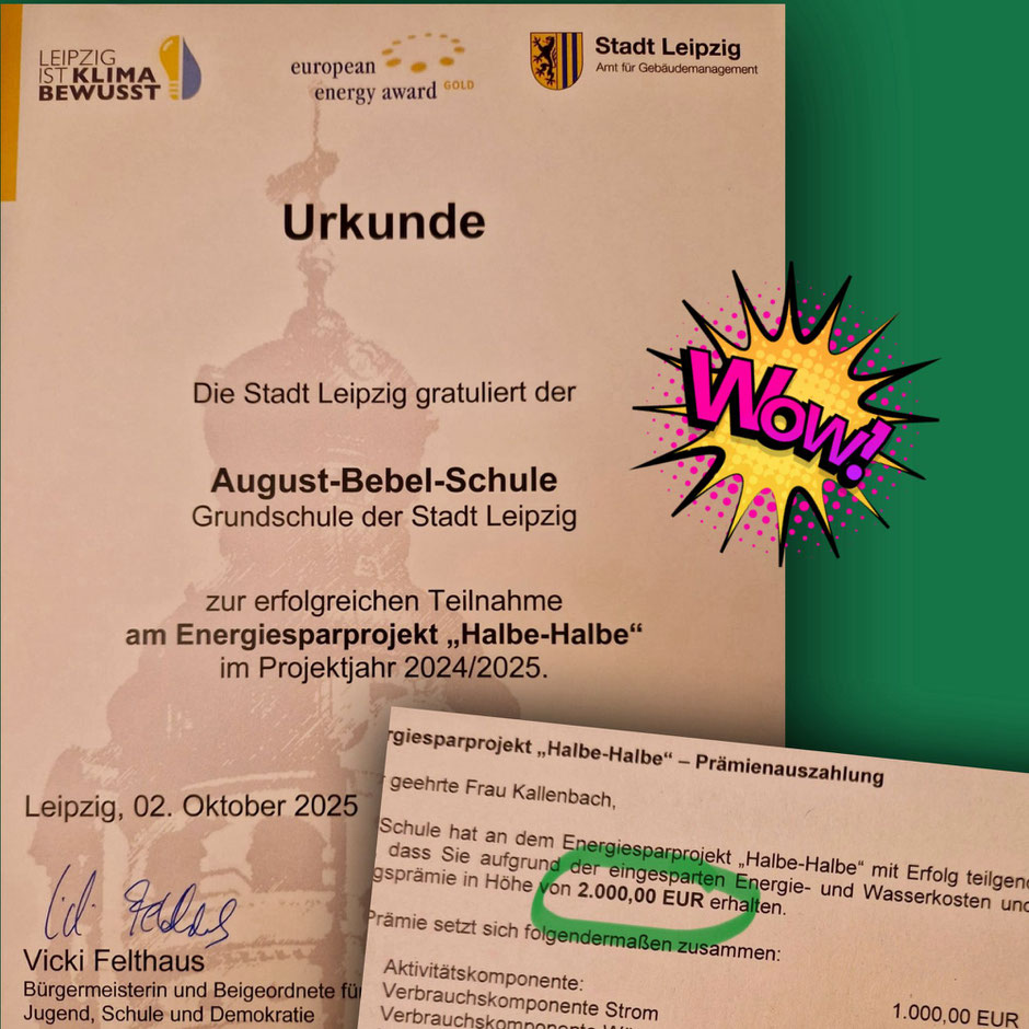 Wir starten mit tollen Neuigkeiten in die Ferien! 💸 Durch unsere Teilnahme am Energiesparprojekt Halbe-Halbe haben wir nicht nur unsere Kinder zu ressourcenschonendem Verhalten angeregt, sondern auch Energie eingespart und dafür gestern eine Prämie in Höhe von 2.000 Euro erhalten! 🥳